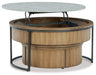 - Coffee table with faux cement melamine top; lift-top mechanism
