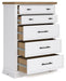 Casual style with substance. This two-tone chest of drawers raises the bar on comfortably cozy design in your soothing sanctuary. A sturdy silhouette with a classic white finish and black metal hardware exudes modern farmhouse vibes. The butcher block oak veneer top adds a relaxed aesthetic. And this charmingly curated piece is spacious enough for all your essentials.