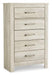 Your bedroom isn’t just a room. It’s a canvas. Express your farmhouse style with this chest of drawers. Wispy white finish over replicated oak wood grain brightens up the space with charm. Brushed nickel-tone handles with black edging finesse the piece with a bit of shine. Drawers are spacious and lined with faux linen laminate to hold your belongings with care. This clean-lined profile is the perfect authentic foundation for inviting decor.