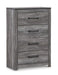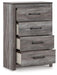 Alluring smoky gray hues create an ambiance that just feels right. This 4-drawer chest has a charming wood-like appeal enriched by a two-tone, textured look. Light neutral shades contrasted by a dark charcoal finish bring a refined yet relaxed feel to contemporary decor and a sense of serenity to your space.