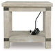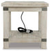 Add a quaint touch of farmhouse style to your living area with this end table. Its beautifully distressed light gray finish enhances the reclaimed wood's natural grain, which delivers a naturally aged feel straight from the countryside. You'll love its generous scale, offering a roomy table top and base shelf that are ideal for displaying accents and more. Large legs, metal accents and the planked effect dress up its country charm._x000D_