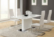 Elevate your dining area with the Anges 5-piece dining set. The contemporary white high gloss finished table features a chrome base for added shine. Complete the ensemble with our iconic Breuer-style chairs, showcasing an ergonomic curved backrest and foam-filled leatherette for ultimate comfort. The U-shaped chrome frame elegantly complements the waterfall edge seat. Available in a range of colors, this set seamlessly merges modern design with unmatched comfort, ensuring every meal is a stylish and comfortable affair. Redefine your dining experience today. Includes: One (1) dining table and four (4) side chairs