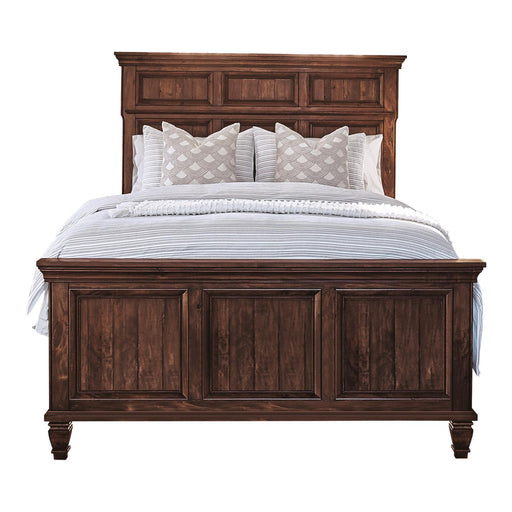 Set an elegant tone in your serene sleep space with this magnificent traditional bed featuring an abundance of style. The exclusive Coaster design is in a weathered burnished brown finish that showcases gorgeous wood grain details. The imposing headboard and footboard both feature clean lines and a paneled design that draws the eye. It also features solid wood, exquisitely turned legs that put the finishing touch on the opulent design of this bed. It's the perfect way to display your taste and preference for the finer aesthetics in life. Includes: One (1) California king bed