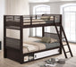 Clean lines and a minimalist aesthetic shine in this contemporary twin bunk bed. With a java finish and bright white cabinets along the base, this stacked twin over twin bunk bed provides a striking contrast and ample sleeping arrangements for a shared sibling bedroom. Sliding doors offer a sleek hidden storage compartment tucked beneath the bottom bunk where you can organize bed linens and other personal items. An attached ladder reaches the top bunk, where guardrails offer additional safety measures. Perfect for contemporary bedrooms, this stylish bunk bed frees up floor space for other bedroom essentials. Includes: One (1) bunk bed
