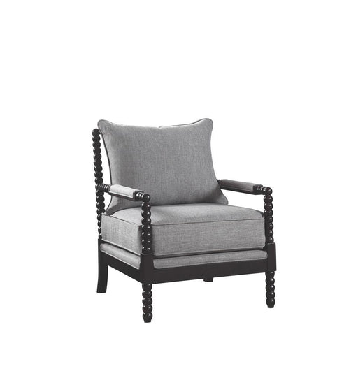 With a modern twist on traditional design, this accent arm chair makes a statement. Warm beige upholstery adds texture to the seat, back, and arms. Rounded sphere details decorate the front legs and frame. Smooth and refined, the silhouette is full of clean angles that elevate a living room. Add visual intrigue to a neutral space with the interesting geometric shapes. Includes: One (1) chair